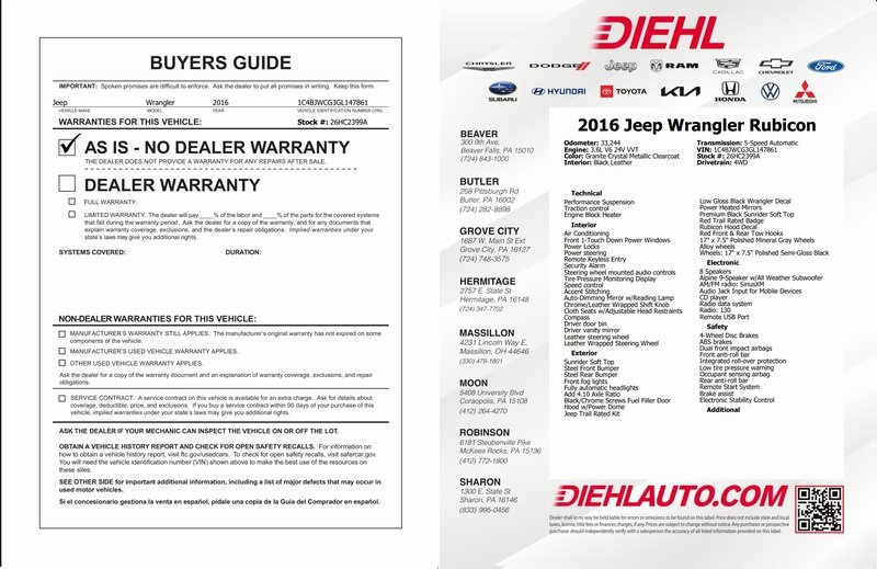2016 Jeep Wrangler Rubicon Rubicon Granite Crystal Metallic Clearcoat Clean CARFAX. CARFAX One-Owner. 17/21 City/Highway MPG