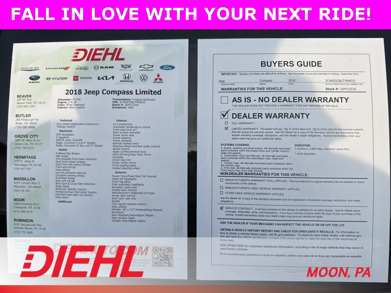 With just 47,418 miles, this 2018 Jeep Compass Limited delivers premium features, everyday versatility, and certified reassurance in one well-rounded SUV package. Your Stellantis Certified Pre-Owned GO Compass is waiting for you at Diehl of Moon Twp.