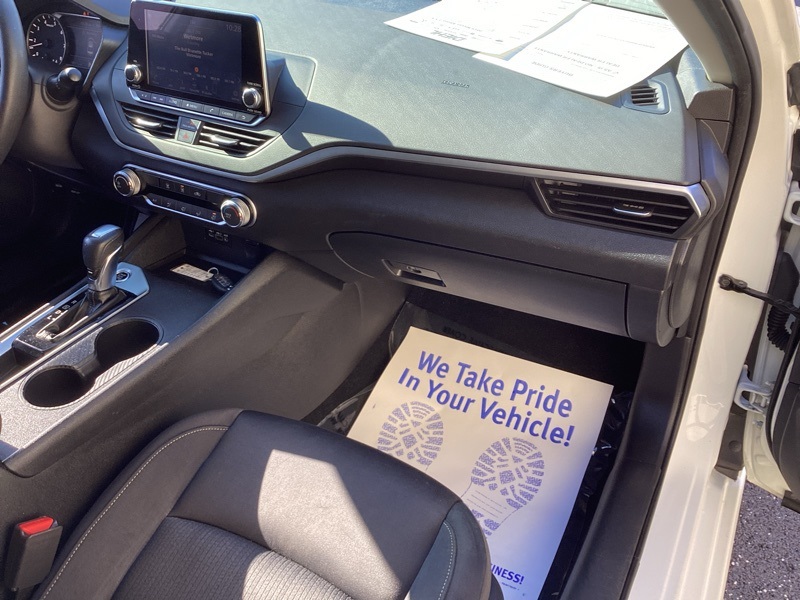 CVT with Xtronic, 4-Wheel Disc Brakes, 6 Speakers, ABS brakes, Air Conditioning, AM/FM radio: SiriusXM, Brake assist, Bumpers: body-color, Cloth Seat Trim, Delay-off headlights, Driver door bin, Driver vanity mirror, Dual front impact airbags, Dual front side impact airbags, Electronic Stability Control, Floor Mats & Trunk Mat, Four wheel independent suspension, Front anti-roll bar, Front Bucket Seats, Front Center Armrest w/Storage, Front reading lights, Fully automatic headlights, Illuminated entry, Knee airbag, Low tire pressure warning, NissanConnect featuring Apple CarPlay and Android Auto, Occupant sensing airbag, Outside temperature display, Overhead airbag, Overhead console, Panic alarm, Passenger door bin, Passenger vanity mirror, Power door mirrors, Power driver seat, Power steering, Power windows, Radio data system, Radio: AM/FM Audio System, Rear anti-roll bar, Rear reading lights, Rear seat center armrest, Rear side impact airbag, Rear window defroster, Remote keyless entry, Security system, Speed control, Speed-sensing steering, Split folding rear seat, Steering wheel mounted audio controls, Tachometer, Telescoping steering wheel, Tilt steering wheel, Traction control, Trip computer, Variably intermittent wipers, Wheels: 16" x 7" Steel w/Full Wheel Covers. Glacier White 2019 Nissan Altima 2.5 S FWD CVT with Xtronic 2.5L 4-Cylinder DOHC 16V