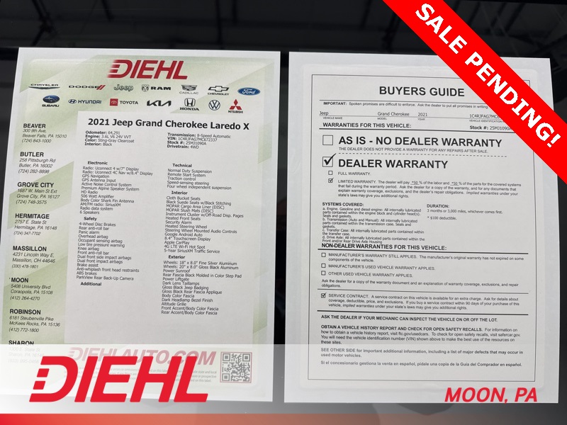 This 2021 Jeep Grand Cherokee Laredo X SUV is waiting for you at Diehl of Moon Twp. Schedule your test drive today and see why this Certified Gold Jeep checks all the right boxes before someone else beats you to it.