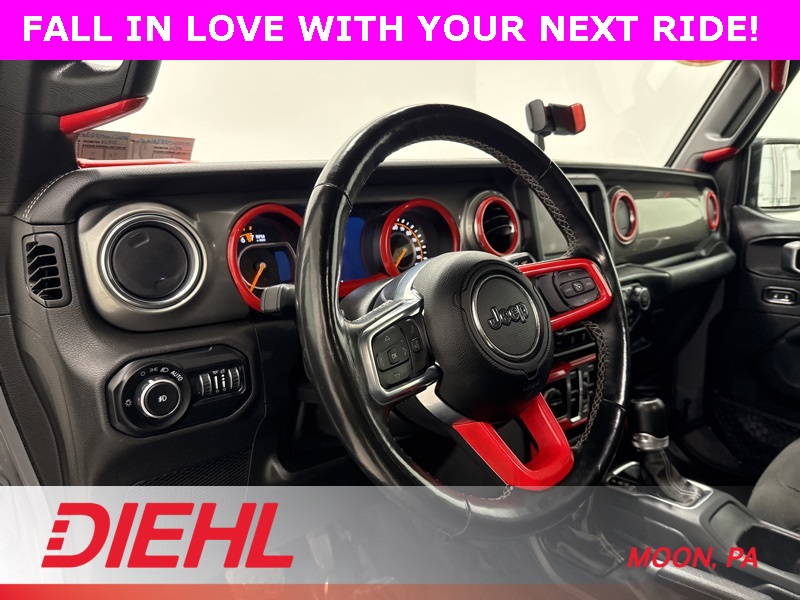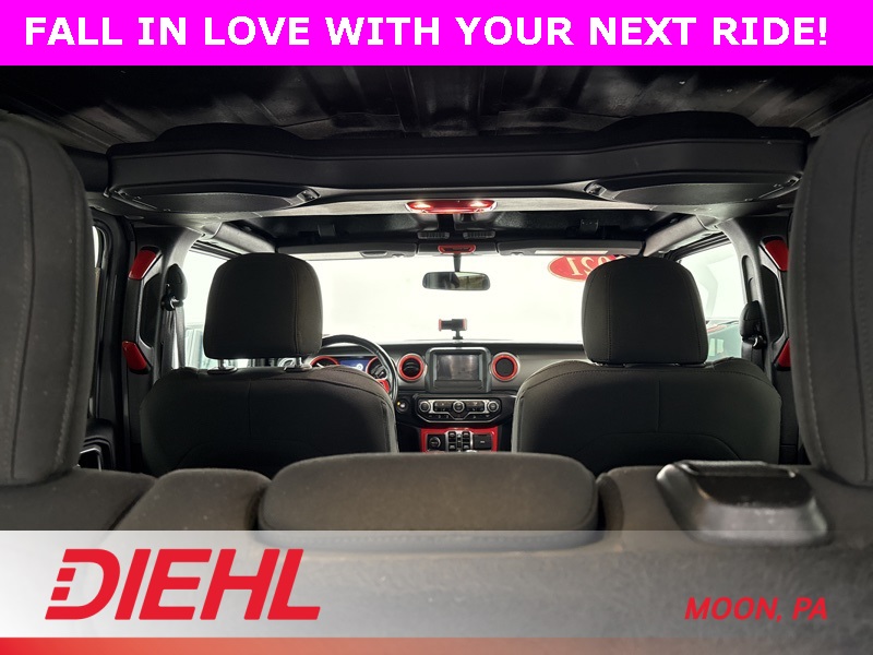 Technology is handled with confidence thanks to Apple CarPlay, Android Auto, Bluetooth connectivity, backup camera, steering wheel audio controls, and smart device integration that keeps your playlists and navigation right where you want them. Outside, the Sahara stands tall with aluminum wheels, all-terrain tires, fog lamps, running boards, privacy glass, and the iconic removable hardtop with rear defrost and targa-style panels for open-air driving whenever the mood strikes.