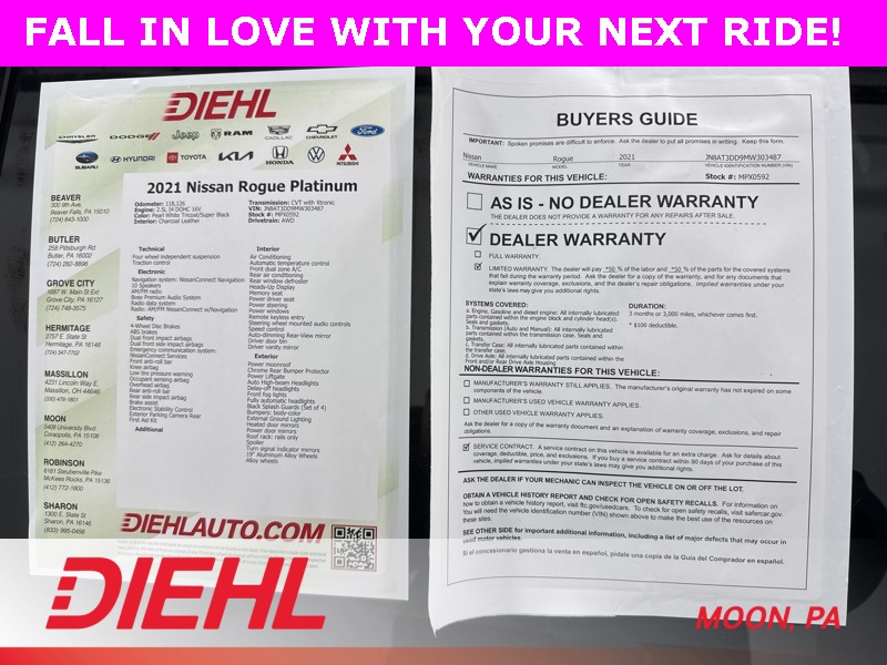 If you are looking for a well equipped, technology packed SUV that still feels refined and capable, this 2021 Nissan Rogue Platinum AWD checks all the right boxes. Find it today at Diehl of Moon Twp before someone else claims it.
