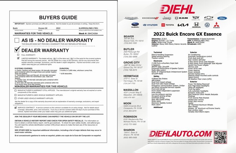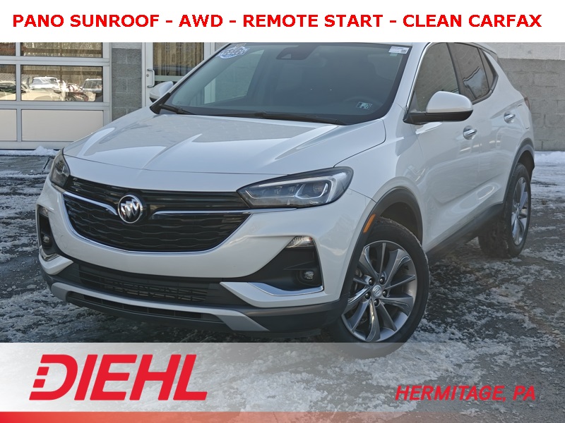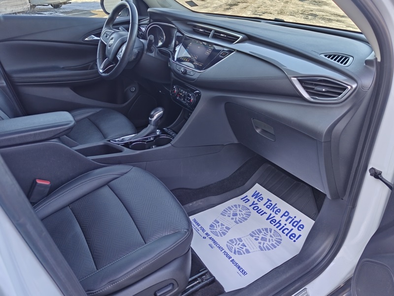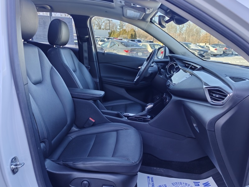 **ONE OWNER**, **CLEAN CARFAX**, **ALL WHEEL DRIVE**, **HEATED SEATS**, **LANE KEEP ASSIST**, **BLIND SPOT DETECTION**, **FRONT CRASH DETECTION**, **BLUETOOTH**, **ALLOY WHEELS**, ** REMOTE START**, **PANO SUNROOF**, **POWER LIFTGATE**, **ANDROID AUTO**, **APPLE CARPLAY*, Encore GX Essence, AWD, White Frost Tricoat, Ebony With Ebony Interior Accents Leather, 18" Machined Aluminum Wheels, 4-Wheel Disc Brakes, 8-Way Power Driver Seat Adjuster, 8-Way Power Front Passenger Seat Adjuster, ABS brakes, Auto High-beam Headlights, Automatic temperature control, Delay-off headlights, Experience Buick Package, Front dual zone A/C, Front fog lights, Fully automatic headlights, Hands Free Power Liftgate, Hands-Free Power Liftgate Package, Heated Driver & Front Passenger Seats, Heated Steering Wheel, Lane Change Alert w/Side Blind Zone Alert, Leather-Appointed Seat Trim, Low tire pressure warning, Memory seat, Power driver seat, Power Tilt-Sliding Moonroof, Preferred Equipment Group 1SL, Rear Cross Traffic Alert, Remote keyless entry, Safety Package II, Steering wheel mounted audio controls, Wireless Apple CarPlay/Wireless Android Auto.