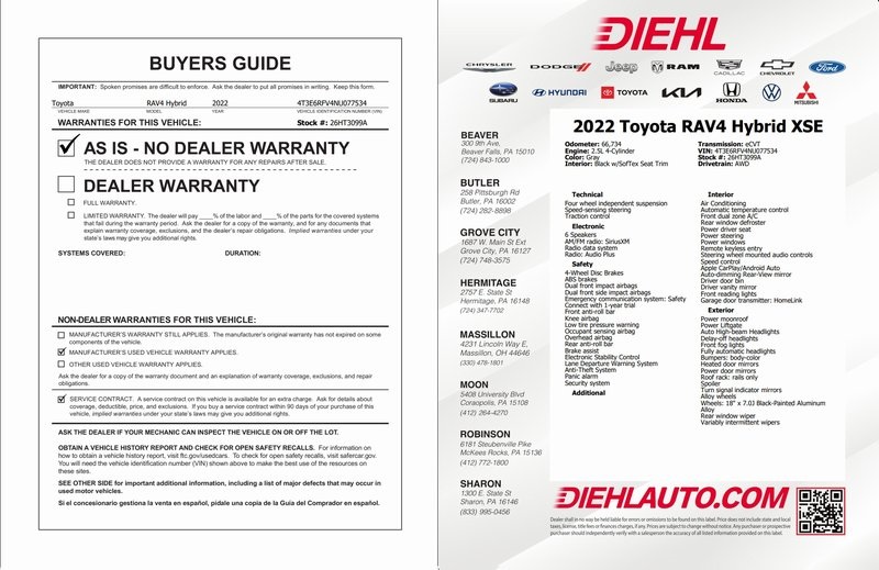 **ONE OWNER**, **CLEAN CARFAX**, **TOYOTA CERTIFIED**, **GAS SAVER!!, **ALL WHEEL DRIVE**, **HEATED SEATS**, **ADAPTIVE CRUISE CONTRL**, **LANE KEEP ASSIST**, **BLIND SPOT DETECTION**, **FRONT CRASH DETECTION**, **BLUETOOTH**, **NAVIGATION**, **PREMIUM WHEELS**, **PANO SUNROOF**, **POWER LIFTGATE**, **ANDROID AUTO**, **APPLE CARPLAY*, RAV4 Hybrid XSE, 2.5L 4-Cylinder, AWD, Gray, 4-Wheel Disc Brakes, ABS brakes, Apple CarPlay/Android Auto, Auto High-beam Headlights, Automatic temperature control, Blind Spot Monitor, Delay-off headlights, Front dual zone A/C, Front fog lights, Fully automatic headlights, Heated Front Seats, Lane Departure Warning System, Low tire pressure warning, Navigation System, Power driver seat, Power Liftgate, Power moonroof, Power steering, Rear window defroster, Rear window wiper, Remote keyless entry, Steering wheel mounted audio controls, Telescoping steering wheel, Tilt steering wheel.
