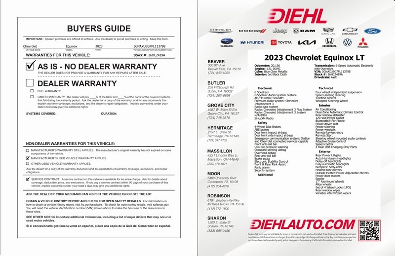 **ONE OWNER**, **CLEAN CARFAX**, **CARFAX MAINTENCE GOLD SHIELD **, **LOCAL TRADE**, **CHEVROLET CERTIFIED**, **ALL WHEEL DRIVE**, **HEATED SEATS**, **LANE KEEP ASSIST**, **FRONT CRASH DETECTION**, **BLUETOOTH**, **BACKUP CAMERA**, **ALLOY WHEELS**, ** REMOTE START**, **360 SURROUND CAMERA**, **POWER LIFTGATE**, **ANDROID AUTO**, **APPLE CARPLAY*, **Parking Sensors**, Equinox LT, AWD, Blue Glow Metallic, Jet Black Cloth, 120-Volt Power Outlet, 17" Aluminum Wheels, 2 Rear USB Charging-Only Ports, 2 USB Data Ports, 2 USB Data Ports w/SD Card Reader, ABS brakes, Adaptive Cruise Control, Advanced Safety Package, Auto High-beam Headlights, Bluetooth® For Phone, Confidence & Convenience Package, Delay-off headlights, Driver Confidence II Package, Driver Convenience Package, Dual-Zone Automatic Climate Control, Front & Rear Park Assist, Fully automatic headlights, HD Surround Vision, Heated Driver & Front Passenger Seats, Heated Steering Wheel, Infotainment Package, Low tire pressure warning, Outside Heated Power-Adjustable Mirrors, Power driver seat, Preferred Equipment Group 1LT, Radio: Chevrolet Infotainment 3 Plus System, Rear Power Liftgate, Remote Start, Safety & Infotainment Package, SiriusXM Radio, Telescoping steering wheel, Tilt steering wheel, Wireless Apple CarPlay/Wireless Android Auto, Wrapped Steering Wheel.