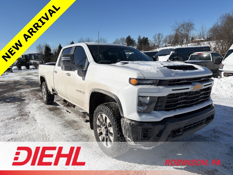 This Summit White Silverado 2500HD Custom is not here to play around. Under the hood lives the Duramax 6.6L V8 turbo diesel paired to a 10 speed automatic transmission, delivering serious towing capability and torque that feels like it could pull Heinz Field a few inches closer to Robinson. The 4x4 drivetrain means snow, mud, job sites, and Pennsylvania winters are simply part of the daily routine.