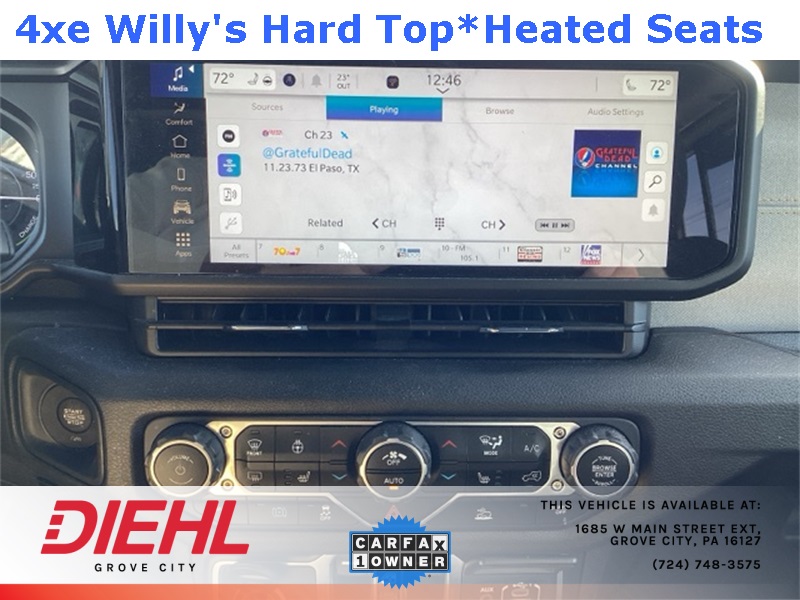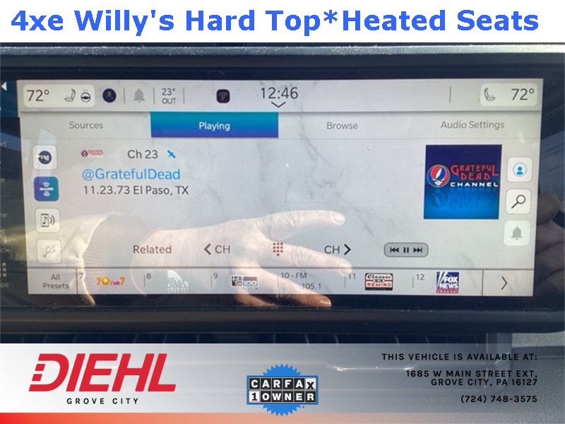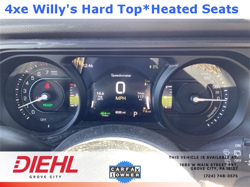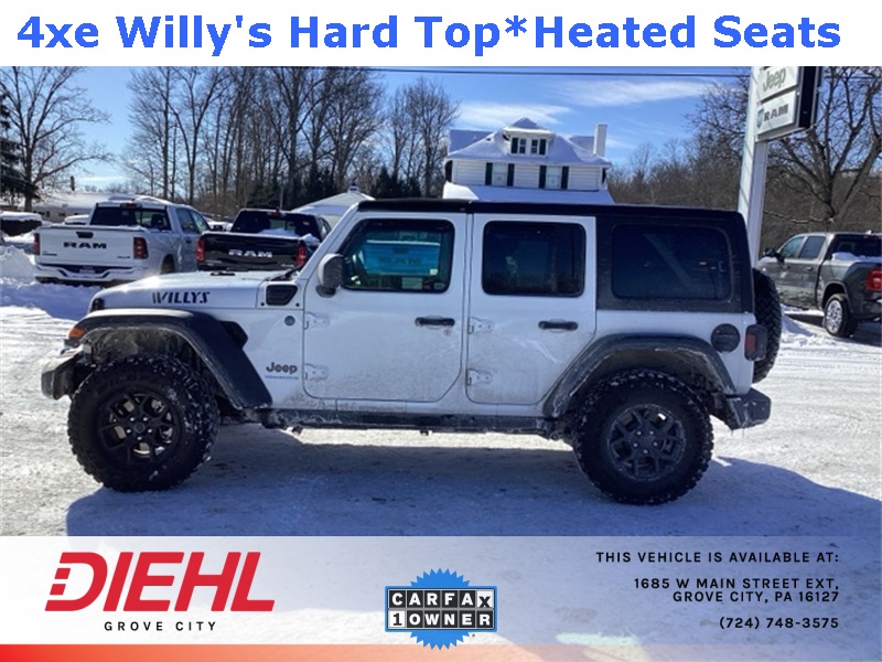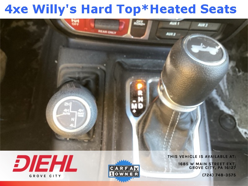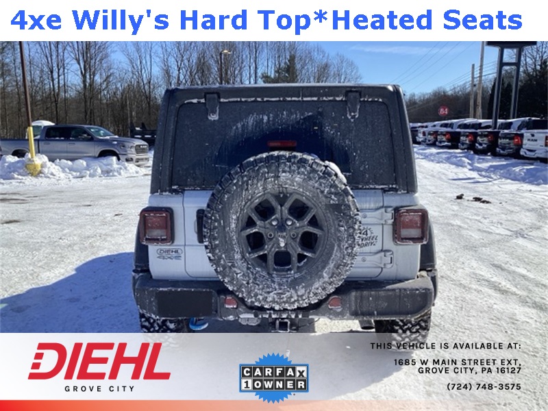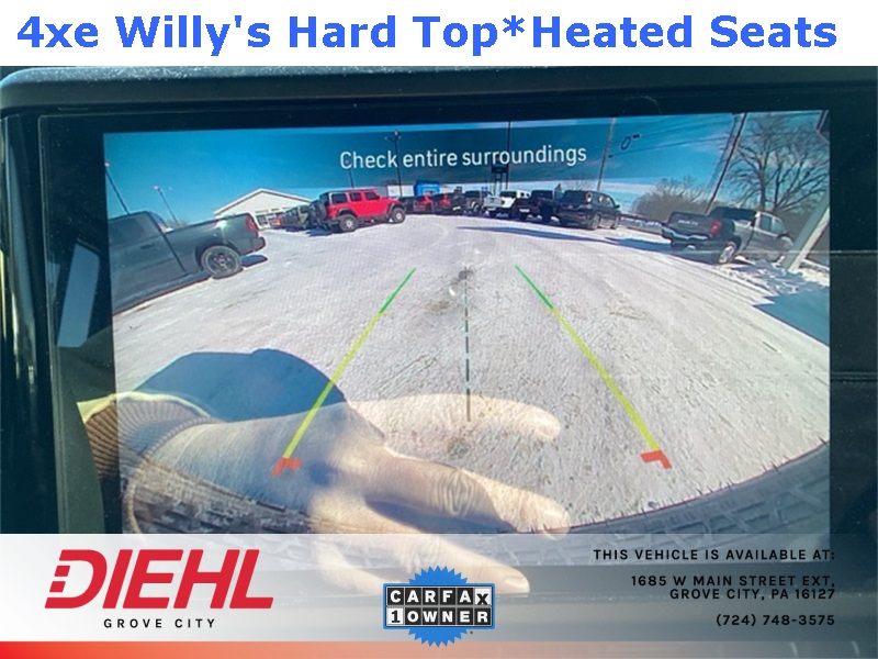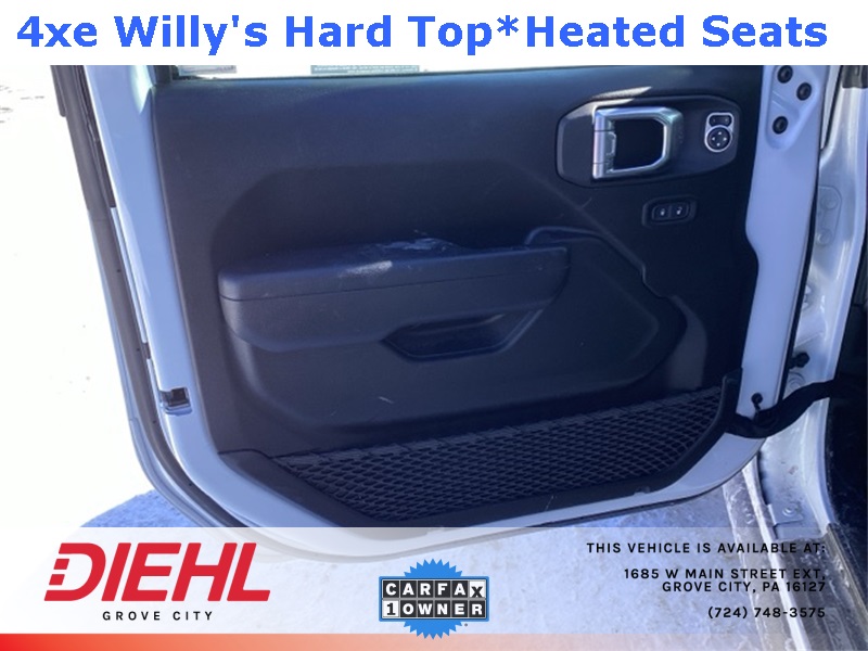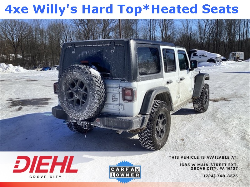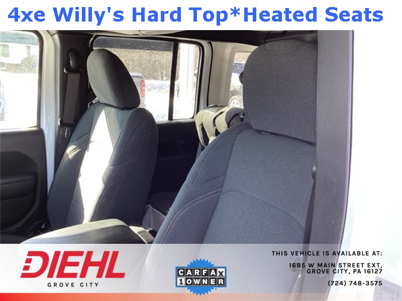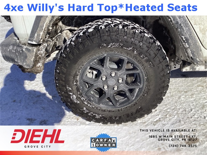**4X4**, 2.0L I4 DOHC, 2-Door Passive Entry, Front Door Locks, 4-Wheel Disc Brakes, 4.10 Rear Axle Ratio, 4xe 4-Wheel Drive Swing Gate Decal, 7 & 4 Pin Wiring Harness, 97 MPH Vehicle Max Speed Calibration, ABS brakes, Auxiliary Switches, Black Grille, Convenience Group, Conventional Differential Front Axle, Dual front impact airbags, Dual front side impact airbags, E-Locker Rear Axle, Emergency/Assistance Call, Front anti-roll bar, Front LED Fog Lamps, Heated Front Seats, Heated Steering Wheel, Integrated roll-over protection, LED Premium Reflector Headlamps, Low tire pressure warning, Molded in Color Rubicon Highline Flare, MOPAR All-Weather Floor Mats, Occupant sensing airbag, Off-Road Plus Mode, Overhead airbag, Quick Order Package 29W Willys, Rear anti-roll bar, Remote Start System, Universal Garage Door Opener, Wheels: 17" x 7.5" Painted Black, Willy's Suspension, Willys, Willys 4xe Hood Decal. CARFAX One-Owner. Clean CARFAX. Priced below KBB Fair Purchase Price!