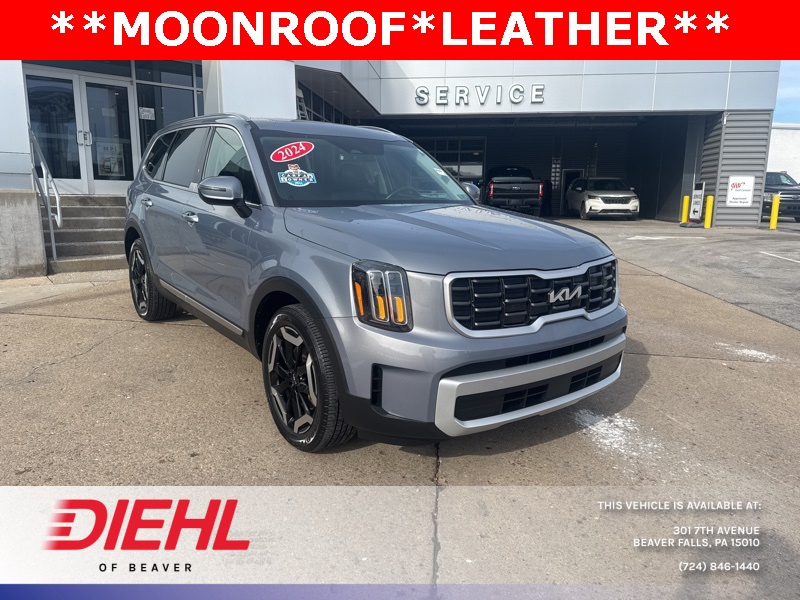 **BACK UP SENSOR**, *KEYLESS START*, **3RD ROW SEATING**, *ALL WHEEL DRIVE*, **BACK UP CAMERA**, **ANDROID AUTO**, **APPLE CAR PLAY**, **HEATED SEATS**, **LANE KEEP ASSIST**, **LEATHER**, **MOONROOF**, **NAVIGATION**, **ONE OWNER**, **POWER DRIVERS SEAT**. Everlasting Silver 2024 Kia Telluride S AWD 8-Speed Automatic 3.8L V6 DOHC