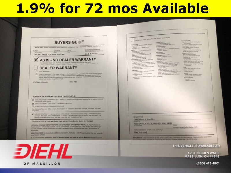 **Clean Carfax**, **One Owner**, **Subaru Certified**, 10-Way Power Driver's Seat, All-Weather Package, Blind Spot Detection (BSD), BSD/RCTA & All Wthr Pkg & Pwr Dr. Seat & Pwr Moonrf, Dual-Mode Heated Front Seats, Heated Power Exterior Mirrors, Power Moonroof, Rear Cross-Traffic Alert (RCTA) System, Windshield De-Icer Wipers. Certified. 2025 Subaru Crosstrek Premium CARFAX One-Owner. Clean CARFAX.